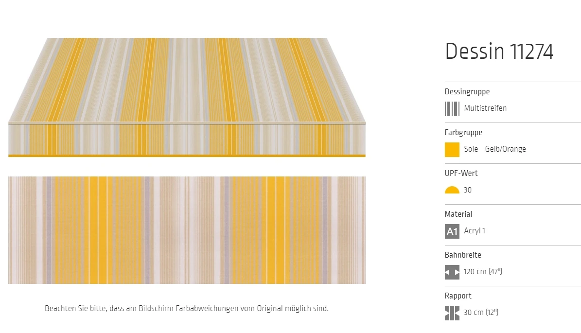 Bei allen Markisenstoffen können Unregelmäßigkeiten in der Oberflächenbeschaffenheit auftreten.
