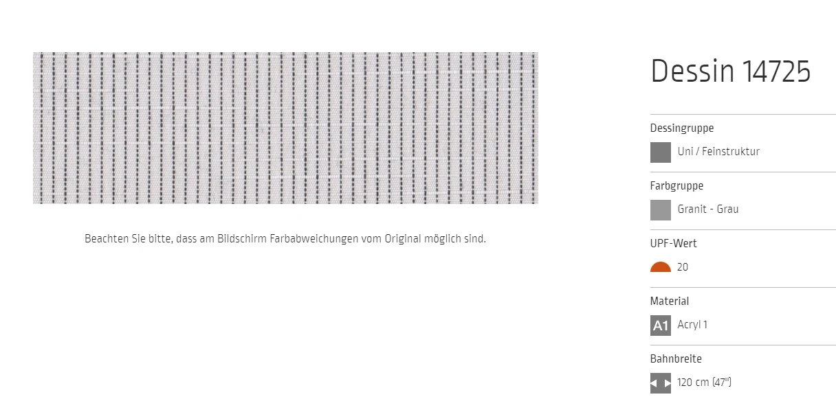 Bei allen Markisenstoffen können Unregelmäßigkeiten in der Oberflächenbeschaffenheit auftreten.