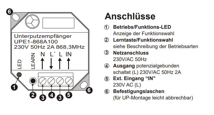 Ausgang: 1 Schließer, schaltet (L), 230V AC / 2A, ohm. Last