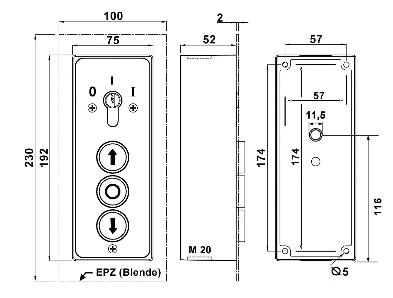 Schlüssel : Ein/Aus Drucktasten: AUF/NOT-HALT/AB, AP Wassergeschützt - Schutzart IP 54