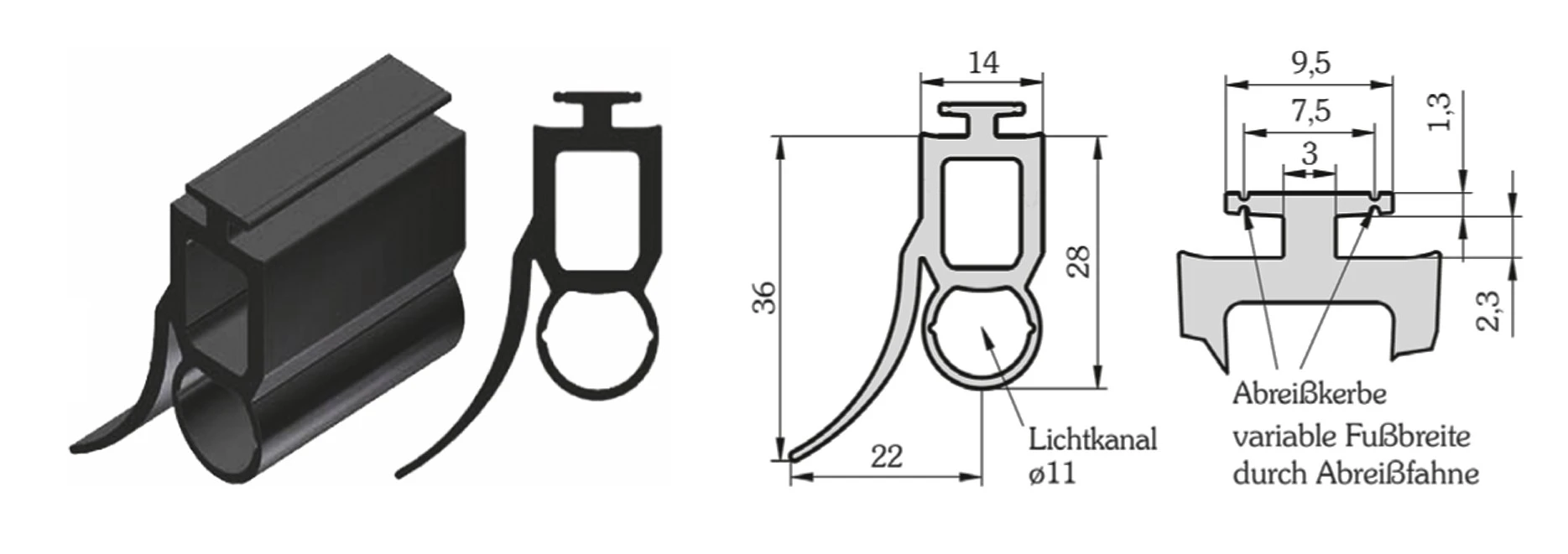 WTS -Gummiprofil für Opto-Sensoren, mit Dichtlippe, für 55/77mm Rollladen-/Rolltorprofile, mit T-Nut 9,5/7,5mm