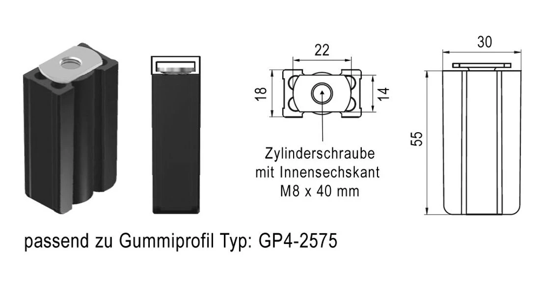 WTS - Auflaufstopper, 30x18x55 mm, mit Innensechskantschraube M8x40mm passend zu Gummiprofil GP 4 - 2575