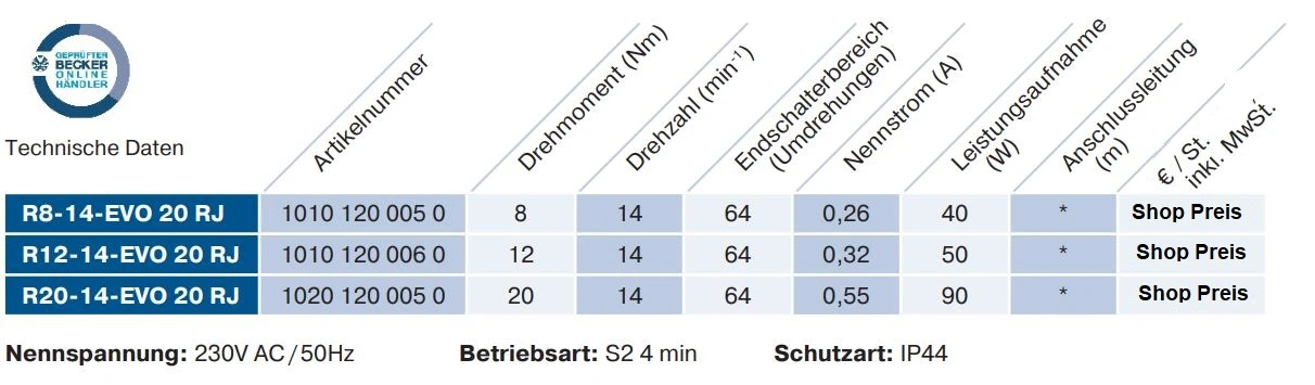 Becker - Rollladenantriebe R8-EVO 20 RJ...R20-EVO 20 RJ der Evolution-Serie für jalousierbare Rollläden