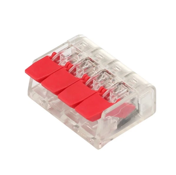Compact-Verbindungsklemme Serie KLV, 4 Leiter mit 4 Betätigungshebeln/Klemmhebeln, Farbe transparent/rot.