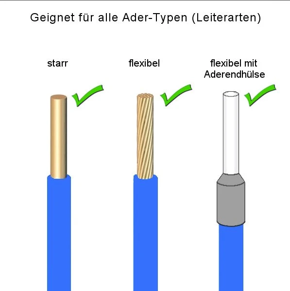 • Für alle Leiterarten: ein-, fein- oder mehrdrähtig bzw. starr/flexibel