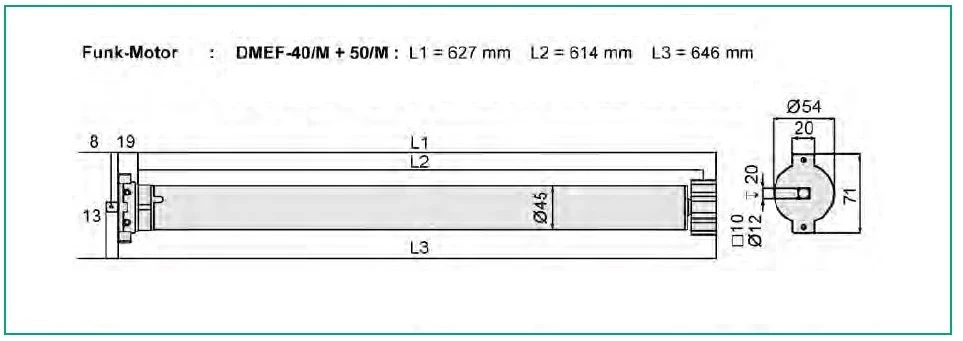 Die Rohrmotoren der Serie DMEF-M verfügen über einen integrierten 433 MHz. Funkempfänger, der eine kabellose Bedienung mittels einer Vielzahl von Funksendern (Handsender, Wandsender, Sonne-Wind Funkstation) ermöglicht. Es können max. 20 Sender bzw. Kanäle eingelernt werden. Weiterhin sind diese Motoren mit einer elektronischen Endabschaltung ausgestattet. Die Einstellung bzw. Programmierung der Endlagen erfolgt schnell und komfortabel über einen Funksender ohne Zugriff auf den Motorkopf. Die untere Endlage (Abschaltung nach dem Ausfahren der Markise) wird als fester Punkt eingestellt, die obere Endlage (Abschaltung nach dem Einfahren der Markise) erfolgt automatisch auf Anschlag im Markisenkasten durch Drehmomenterkennung.