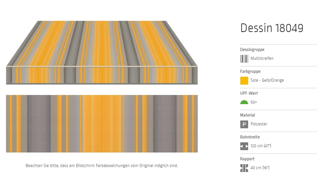 Bei allen Markisenstoffen können Unregelmäßigkeiten in der Oberflächenbeschaffenheit auftreten.