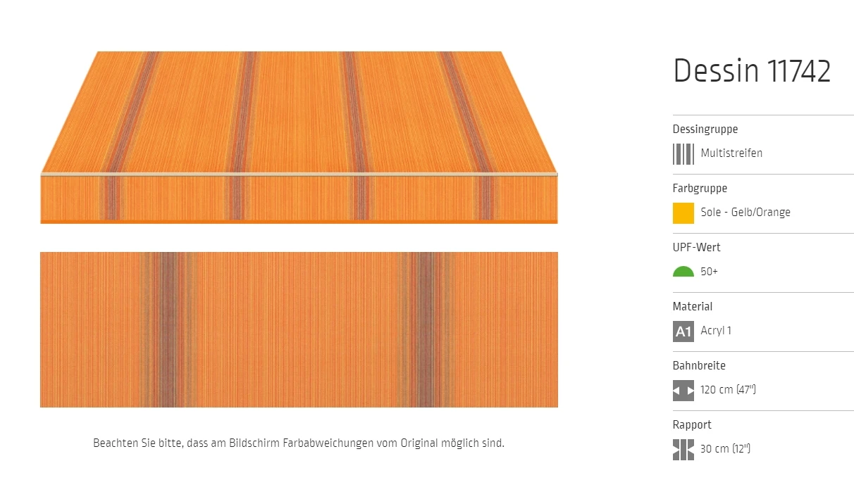 Bei allen Markisenstoffen können Unregelmäßigkeiten in der Oberflächenbeschaffenheit auftreten.