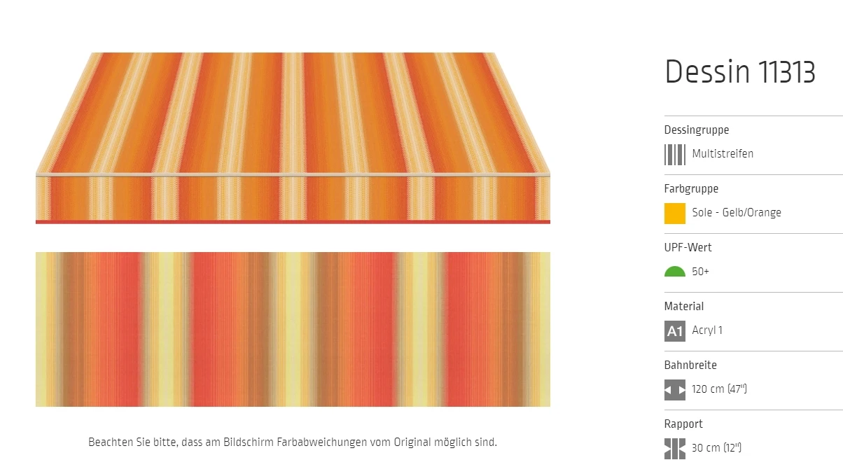 Bei allen Markisenstoffen können Unregelmäßigkeiten in der Oberflächenbeschaffenheit auftreten.
