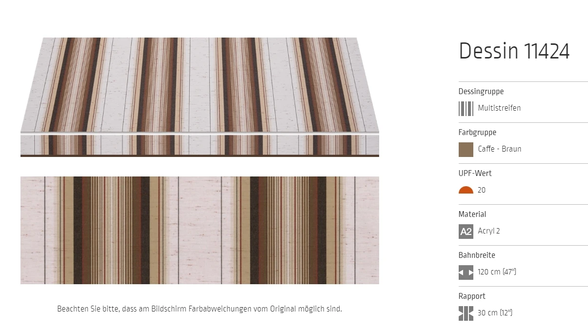 Bei allen Markisenstoffen können Unregelmäßigkeiten in der Oberflächenbeschaffenheit auftreten.