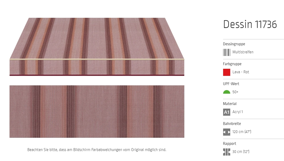 Bei allen Markisenstoffen können Unregelmäßigkeiten in der Oberflächenbeschaffenheit auftreten.
