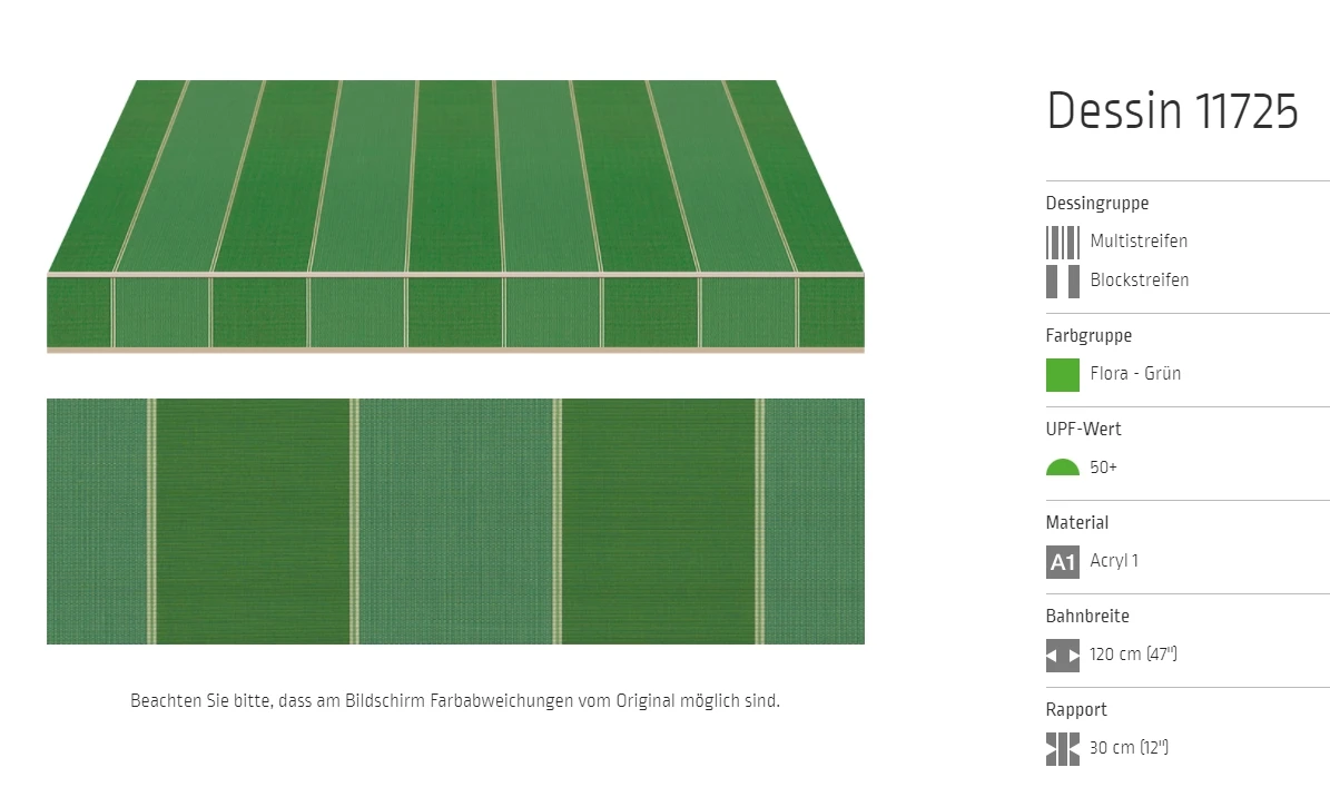 Bei allen Markisenstoffen können Unregelmäßigkeiten in der Oberflächenbeschaffenheit auftreten.