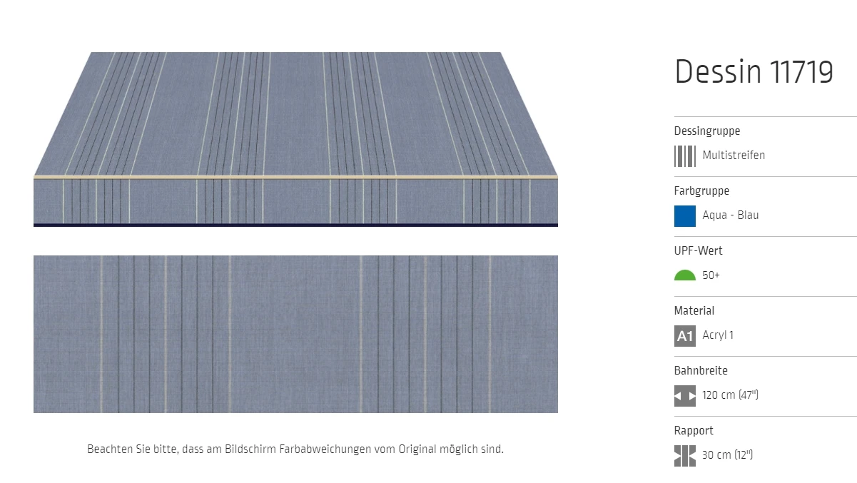 Bei allen Markisenstoffen können Unregelmäßigkeiten in der Oberflächenbeschaffenheit auftreten.