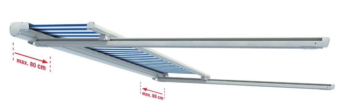 Mit einer maximalen Einzelfeldbreite bis 700 cm (als Typ PERGOLA bis 600 cm) und einer Ausfalltiefe bis maximal 600 cm überspannt die CAPRI auch große Glasflächen. Für noch größere Glasflächen bieten wir Ihnen die CAPRI Typ DACHMONTAGE als Koppelanlage bis zu einer Breite von 1.200 cm an.