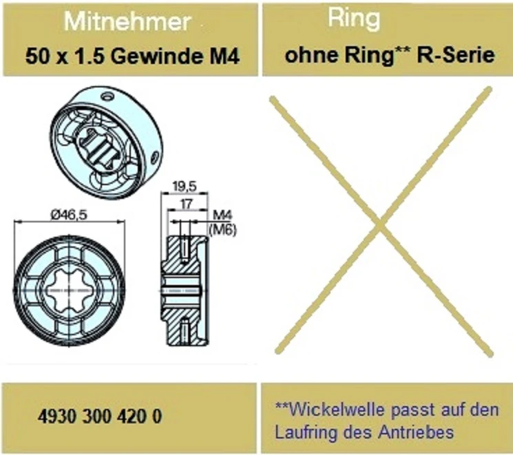 Adapter für Rundrohr Mitnehmer 50 x 1.5 Gewinde M4,  für Rohrmotore Becker Baureihe P und R Serie