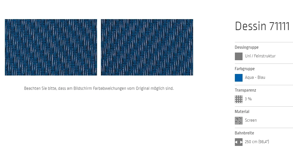 Markisentuch Screen-Gewebe, Aqua - Blau, Transparenz 3 Prozent, Stoff-Nr. 71111