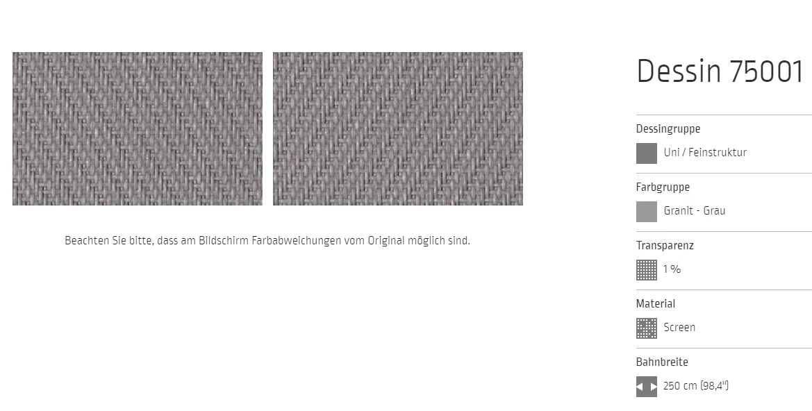 Markisentuch Screen-Gewebe, Granit - Grau ,Transparenz 1 Prozent, Stoff-Nr. 75001