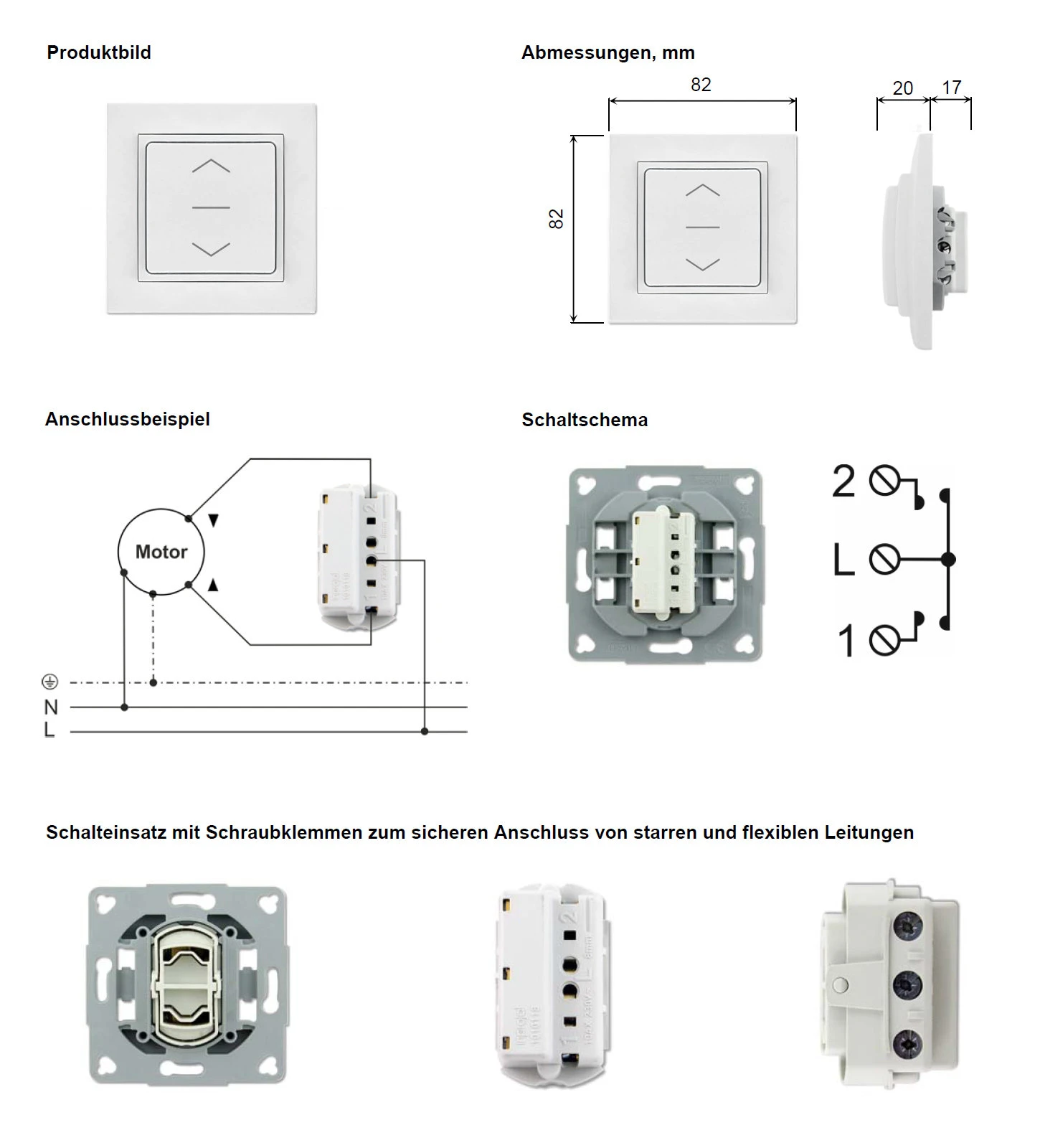Wipptaster mit Mittelstellung UP, Tast-Funktion, IP20, max. 10A, 250V~, 1-polig, mit Schaltwippe und Abdeckrahmen des Schalterprogramms LENORA, mit Schraubklemmen (max.2,5mm²) und Traggestell für die Schraubbefestigung in der Installationsdose. Funktionsweise: 2 Schaltstellungen (AUF, AB) und STOPP in der Mittelstellung Farbe: ultraweiß (ähnl. RAL 9010)
