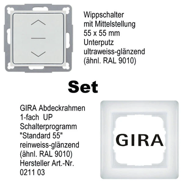 • Wippschalter mit Gira „System 55“ 1-fach Abdeck-/Kombirahmen