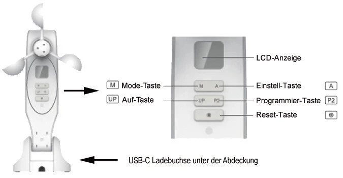 Solar Wind-Sonne Funkstation 433MHz, Funksensor mit integrierter Automatik für Wind + Sonne, mit integriertem Akku, mit USB-C Ladeanschluss, für Markisen, nur in Verbindung mit DMF Funk-Motoren oder Funk-Empfänger und einem DMF-Handsender einsetzbar