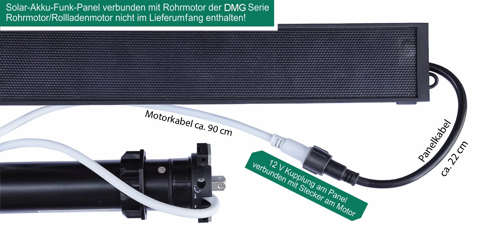 Dieses Solar-Akku-Funk-Panel dient zur Stromversorgung und als Funk-Empfänger der DMG-Gleichstrom-Rohrmotoren 12V/DC (mit max. 20Nm) über Solarzellen, Schutzart IP 55, mit integriertem Funkempfänger, 433MHz, mit integriertem Lithium-Akku, 3Ah, 12V, mit integriertem USB-Ladeanschluss (USB-Ladespannung 5V/DC)